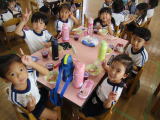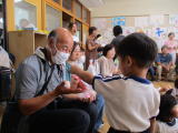 5歳児は、実際に歯磨きの仕方を教わり、その場で一緒に磨きました。4歳児はクラスに戻って、先生と一緒に歯磨きをしました。