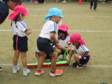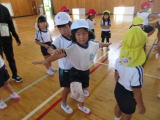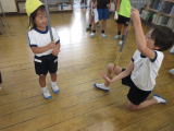 ペアの友達と一緒にフープ遊びをしました。電車ごっこやフープの陣取りなどをペアの友達と楽しみました。