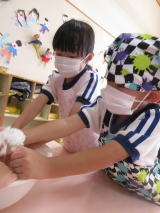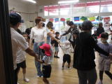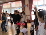4・5歳児は、歌や律動、友達同士のふれあい遊びを見てもらい、その後は親子で一緒にじゃんけん列車を楽しみました!最後に、親子でこいのぼりの仕上げをしました♪