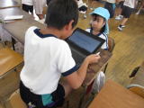 まずは1年生との交流。爆弾ゲームで当たった子が自己紹介をする遊びを行いました。その後、ペアになった1年生と一緒に校庭にある遊具で遊ばせてもらい、運動遊びにいっぱい挑戦しました。