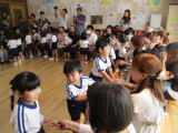 親子で入場したよ。みんなで手遊びをしよう。進級児もお祝いしてるよ