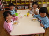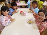 今月の誕生日メニューはホットケーキ・フルーツ・りんごゼリーです。幼稚園でのクッキングメニューが初めての3歳児もみんな嬉しそうに食べていました!!