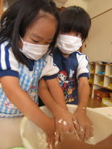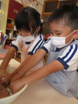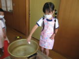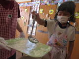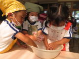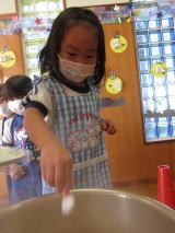 7日(火)お月見会を行い、4・5歳児はお団子作りをしました。グループに分かれて、最初から最後までの行程をすべて自分達で行いました。