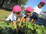 4・5歳児は個人の植木鉢で1種類の野菜を育て、クラスの野菜を畑で育てました。実のなっていく様子を観察しながら、大きさや形を比べたり数を数えたりして収穫をしました。