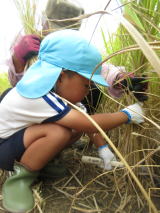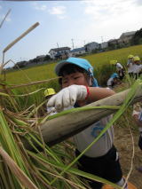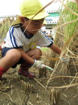 14日(火)4・5歳児は、あぐり六分一営農組合のご協力で稲刈り体験をさせていただきました。一人ひとりに丁寧に教えてくださったおかげで、どの子も、鎌を使って上手に稲刈りをすることができました。