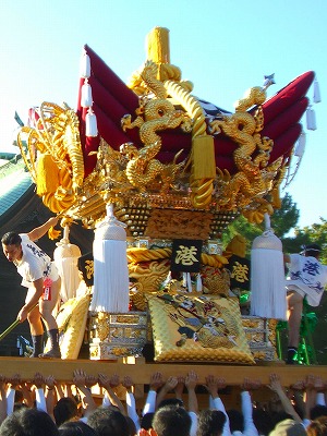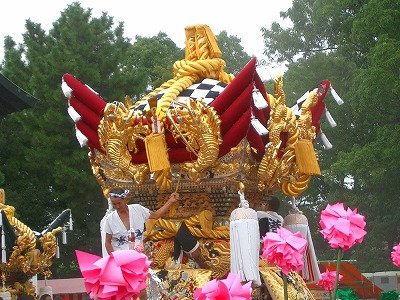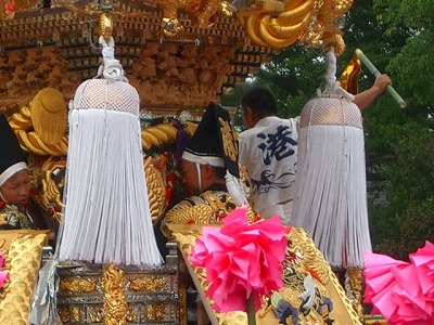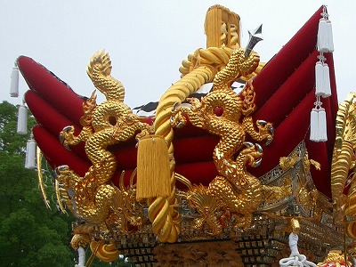 高須 布団の色:「海老茶」 梵天:前後「海老」、左右「龍」 特徴:昼提灯ではなく大きな房が取り付けられている。天幕は市松模様。 平成16年新調、先代屋台は福崎町の長目へ 脇梵天の龍 屋台四隅に付けられた房提灯 戻る